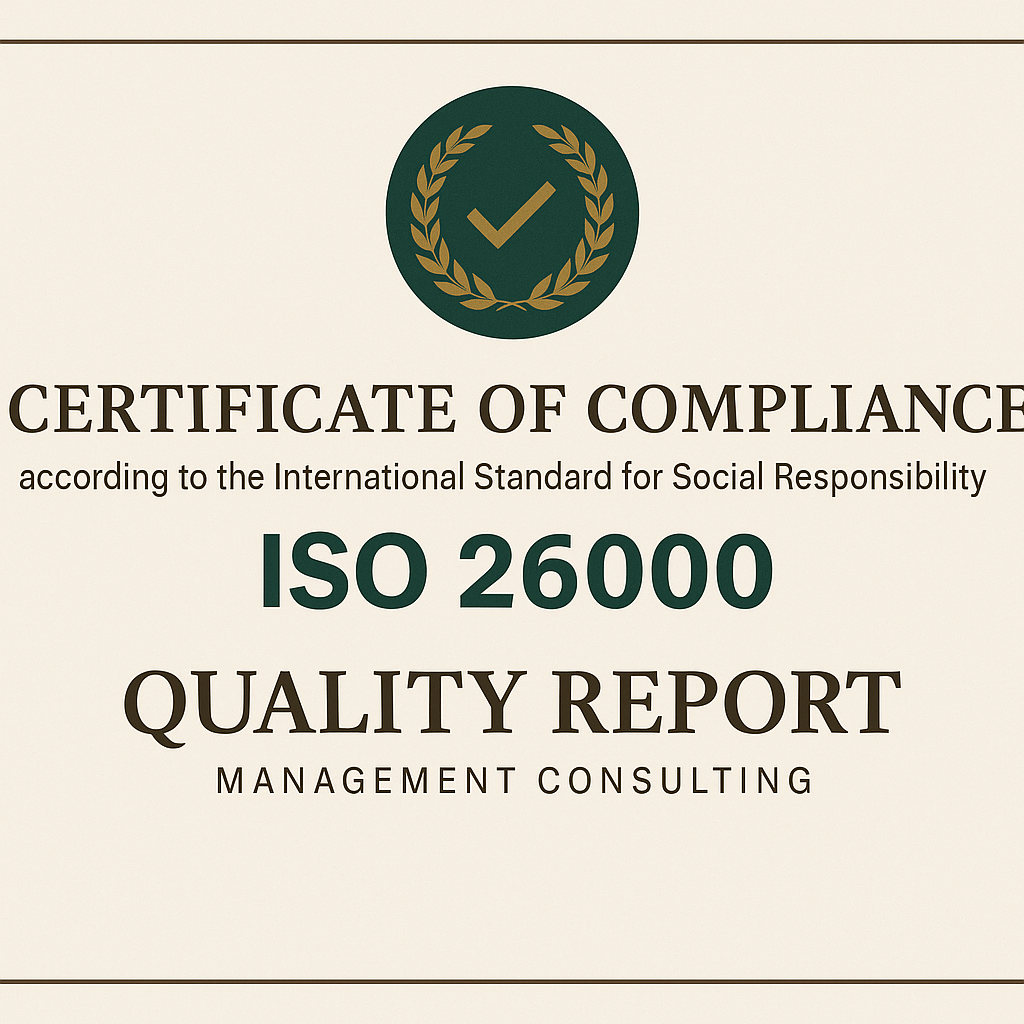 ملاحظة مهمة: ISO 26000 إرشادية وليست نظام شهادة “مطابقة” مثل ISO 9001؛ لذلك نقدّم في كواليتي ريبورت برنامج تأهيل وتحقق ومنح “شهادة امتثال” تثبت أن الجمعية طبّقت الإرشادات بشكل منهجي ويمكن التحقق منه.